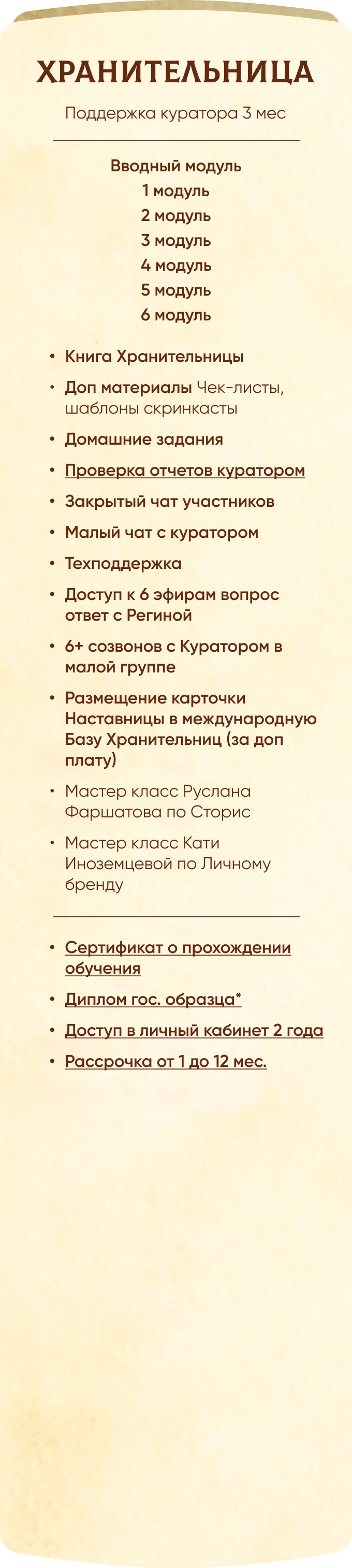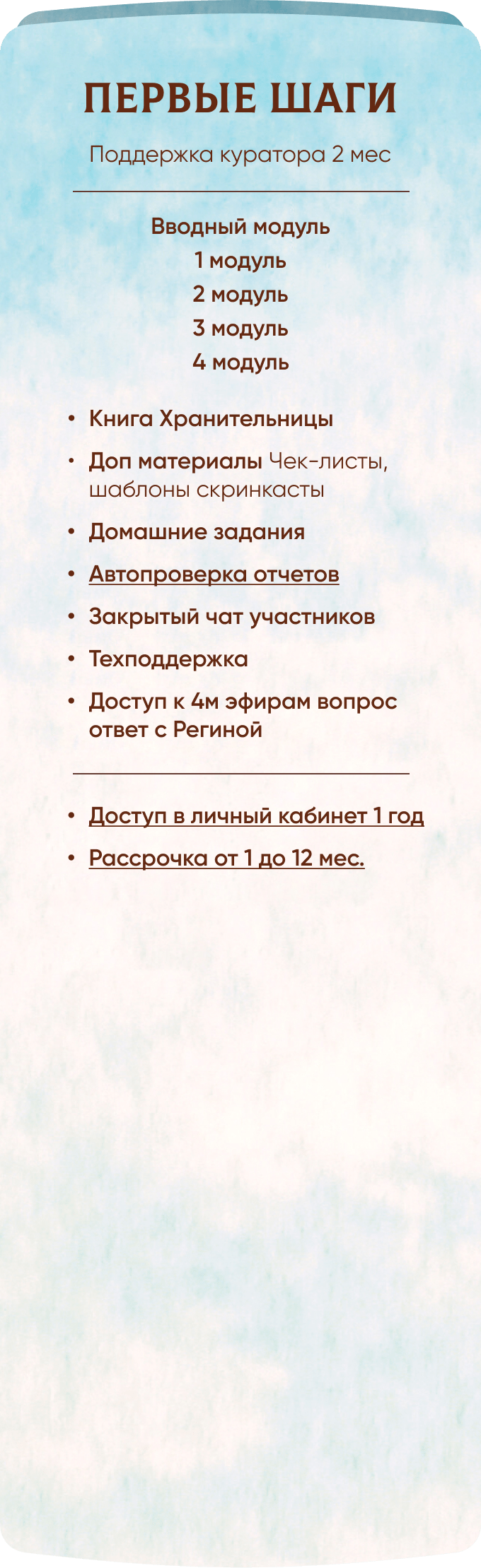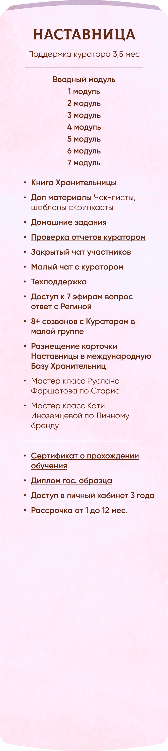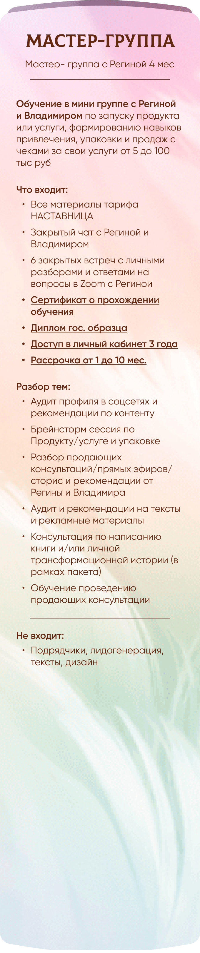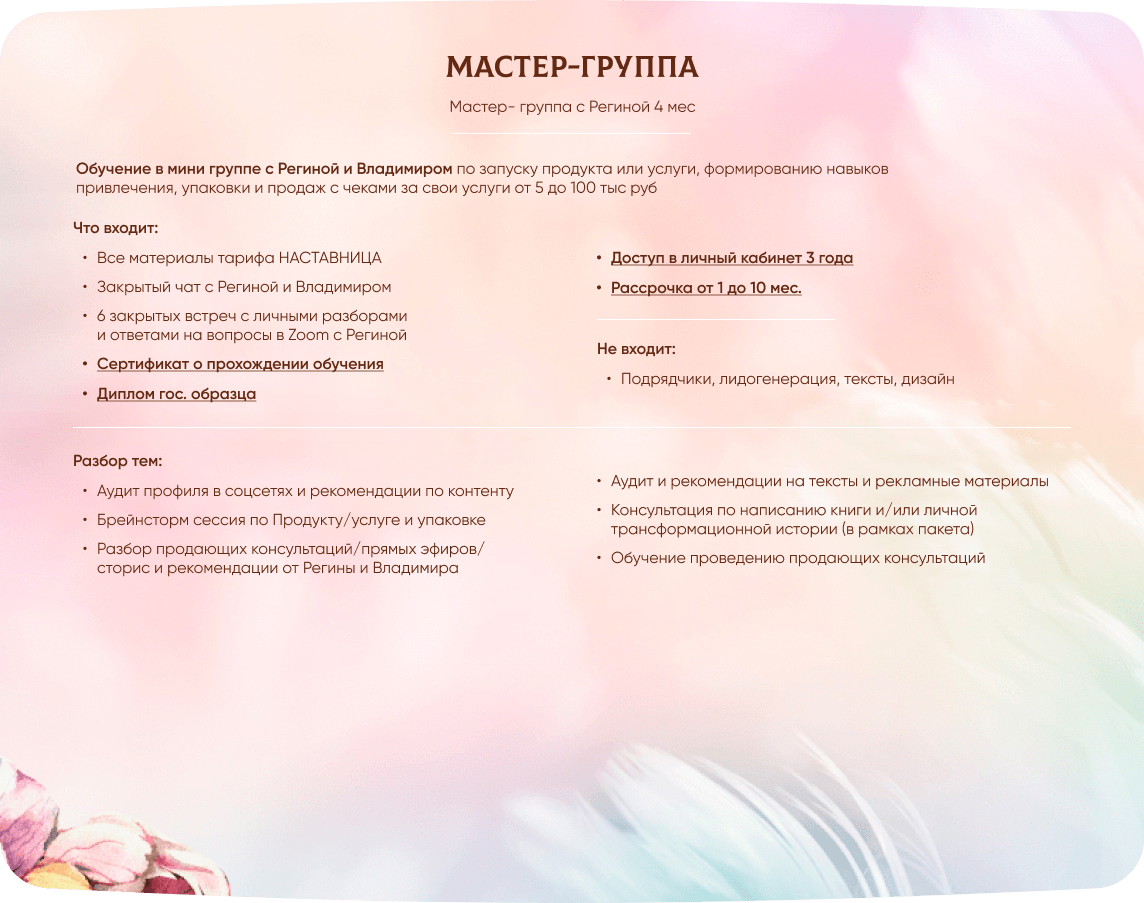 В пакетах “НАСТАВНИЦА” и “МАСТЕР-ГРУППА” – входит в стоимость обучения.